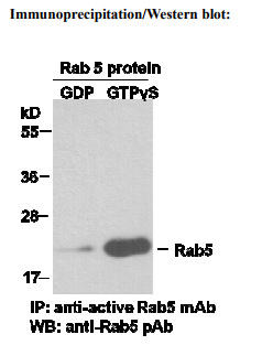 ![]() | Rab5 activation assay. Purified full-length Rab5A proteins were immunoprecipitated after treated with GDP (lane 1) or GTPγS (lane 2). Immunoprecipitation was done with the anti active Rab5 monoclonal antibody (Cat. No. 26911). Immunoblot was with an anti Rab5 polyclonal antibody (Cat. No. 21151). |