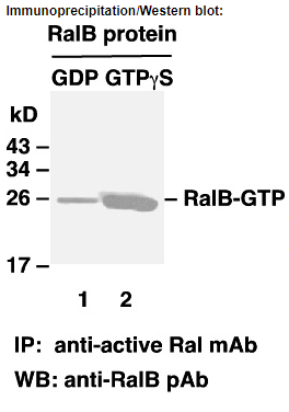 ![]() | Ral activation assay. Purified RalB proteins were immunoprecipitated after treated with GDP (lane 1) or GTPγS (lane 2). Immunoprecipitation was done with the anti active Ral monoclonal antibody (Cat. No. 26913). Immunoblot was with an anti RalB rabbit polyclonal antibody (Cat. No. 21033). |