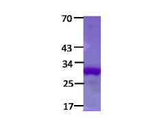 The purity of His-tagged NFE2L2 D29G was determined by SDS-PAGE and Coomassie Brilliant Blue Staining. |