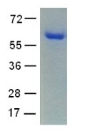 Preparation Instructions: Centrifuge the vial before open the cap and reconstitute in water. Adding of 10 mM β-mercaptoethanol or 1 mM DTT into the solution to protect the protein is recommended and using of non-ionic detergents such as n-Dodecyl β-D-maltoside(DoDM) or polyethylene detergents (e.g. C12E10) also help to stabilize the protein. Avoid repeated freezing and thawing after reconstitution. The purity of His6-tagged. Fascin was determined by SDS-PAGE and Coomassie Brilliant Blue Staining |