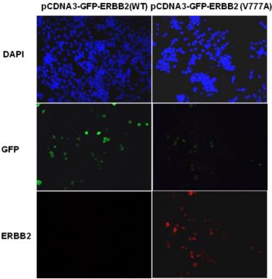 Background: The ErbB family is composed of four plasma membrane-bound receptor tyrosine kinases. Amplification or over-expression of the ERBB2 gene occurs in approximately 30% of breast cancers. HER2 is encoded by ERBB2, a known proto-oncogene located at the long arm of human chromosome 17(17q21-q22). HER2 proteins have been shown to form clusters in cell membranes that may play a role in tumorigenesis. Mutations of ErbB2 protein, including V777A, have been indicated in human cancers. |