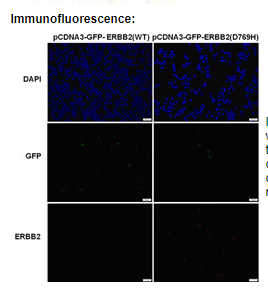 ![]() | Immunofluorescence of cells expressing ERBB2 proteins with Anti ERBB2(D769H) antibody. HEK293T cells were transfected with pCDNA3-GFP ERBB2(WT) plasmid (left column) or pCDNA3-GFP ERBB2(D769H) plasmid (right column), then fixed and stained with Anti ERBB2(D769H) monoclonal antibody (Cat. #26381). |
