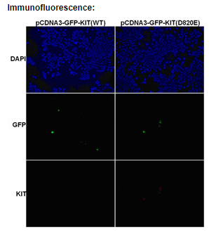 ![]() | Immunofluorescence of cells expressing KIT proteins with Anti KIT(D820E) antibody. HEK293T cells were transfected with pCDNA3-GFP KIT(WT) plasmid (left column) or pCDNA3-GFP KIT(D820E) plasmid (right column), then fixed and stained with anti KIT(D820E) monoclonal antibody (Cat. #26274). |