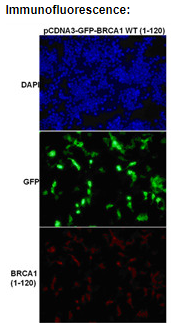 ![]() | Immunofluorescence of cells expressing BRCA1(1-120)protein with Anti BRCA1(1-120) antibody. HEK293T cells was transfected with pCDNA3-GFP-BRCA1(1-120) plasmid, then fixed and stained with Anti BRCA1(1-120) monoclonal antibody (Cat. #26351-1). |