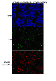 ![]() | Immunofluorescence of cells expressing BRCA2(2213-2543)protein with Anti BRCA2(2213-2543) antibody. HEK293T cells was transfected with pCDNA3-GFP-BRCA2(2213-2543) plasmid, then fixed and stained with Anti BRCA2(2213-2543) monoclonal antibody (Cat. #26364-3). |