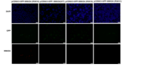 Immunofluorescence of cells expressing SMAD4 proteins with Anti SMAD4(R361H) antibody. HEK293T cells were transfected with pCDNA3-GFP-SMAD4(R361H) plasmid pCDNA3-GFP SMAD4(WT) plasmid, pCDNA3-GFP SMAD4(R361S) plasmid or pCDNA3-GFP SMAD4(R361C) plasmid, then fixed and stained with Anti SMAD4(R361H) monoclonal antibody (Cat. #26422). |