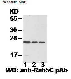 EC-1 (lane 1) , HEK-293T (lane 2) and MEF (lane 3) cell lysates were used for Western blot with anti Rab5C polyclonal antibody (cat # 21038).